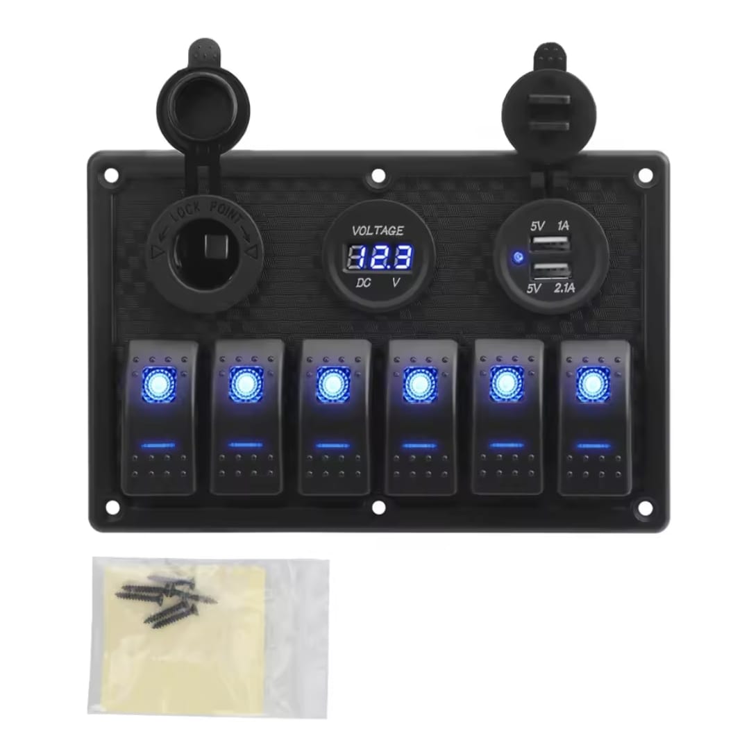 - Totalmente funcional: Este panel de interruptores tiene pantalla de voltaje digital, indicador de luz LED, placa impermeable, cargador de 12V y adaptador de corriente USB doble de 5V.